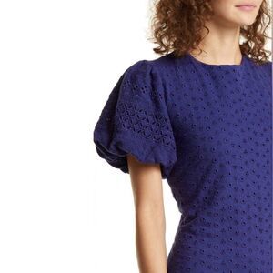 Darling puff sleeves frame this cotton frock covered in airy embroidered eyelets.