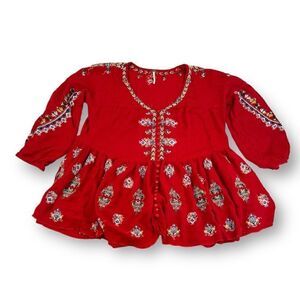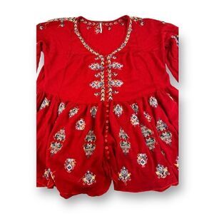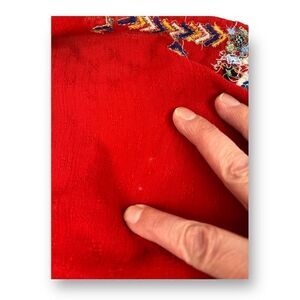 Preowned, good used condition. Loose threads in embroidery. Two thin spots in the material on the back.