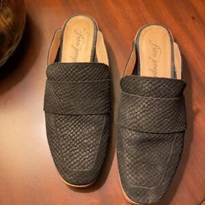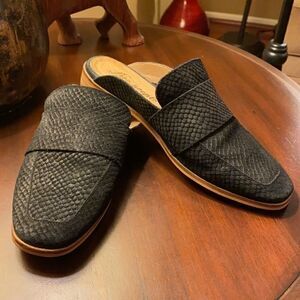 In good preowned condition Just minor signs of wear on the soles(as in dirt from wear) A squared apron toe and an unadorned bridge update this loafer mule cut from snakeskin-textured leather. 1" heel Leather and textile upper/leather or textile and leather lining/synthetic sole Made in Spain