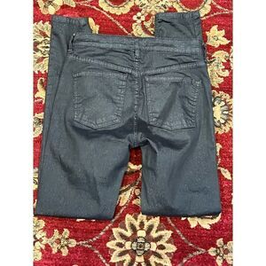 Made of 98% cotton and 2% spandex and are machine washable. Laying flat measure 14” in the waist, 16” in the hips, and have a 28” inseam. Feature sparkle print all over, back pockets, front zipper in button closure, belt loops and faux front pockets.