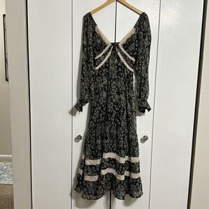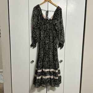 Forever femme in a timeless floral print, this classic maxi dress is featured in a vintage-inspired, flowy silhouette with contrast, lace-adorned seaming for added dimension.