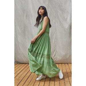 Lovely in a shapeless silhouette, this essential maxi dress is featured in a V-neck, lace-tiered silhouette with dropped armholes and pleating for added dimension.