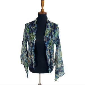 Super cute and colorful chiffon shawl from free people. Features a geometric pattern with bright vertical stripes all over. Has bell arm sleeves. Very flowy and beautiful!