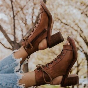 Step to the beat of your own drum in the leather Free People City Of Lights open-toe booties with exposed heel accent. Lace closure with pull-tab at the heel Lightly padded, leather footbed and stacked platform, heel, and outsole