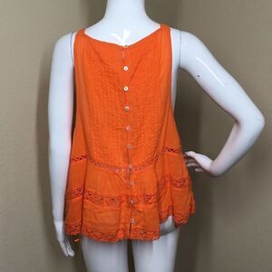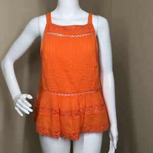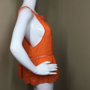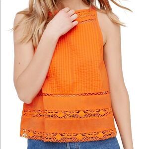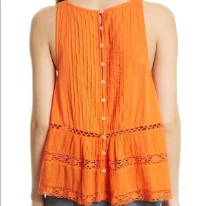 Slim crochet panels elevate a lightweight tank styled with accordion pleats and a flared hemline.