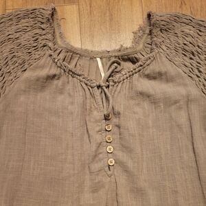 Great preloved condition. Button front with tie. Raw hem. 2 side pockets. Bust Measurements laying flat is 24 inches. Length is 30 inches.Color is like Olive Pls see pictures for details. Thank you