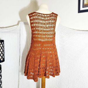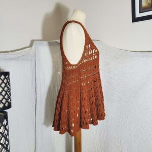 Orange brick open crochet sleeveless top. Has a small imperfection as seen on last picture. Pre-owned in good condition. Please refer to pictures for best description and condition verification.