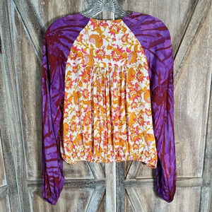 Release your mind and cruise through life in this billowy surplice top splashed in boho blossoms and swirling tie-dye.