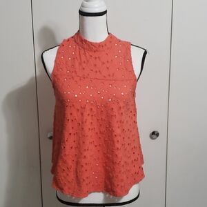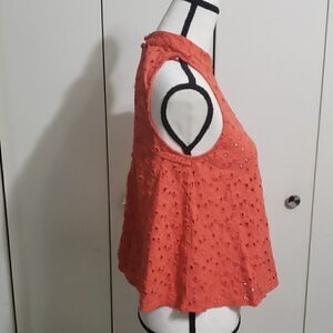 Sheer floral lace eyelet pattern. Diamond shaped keyhole cut out back with button closure. High mock neck has double button closure. Slightly cropped, pleated, flowy swing hem. Size medium.