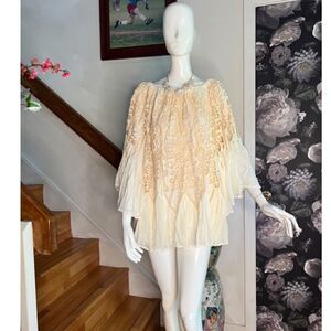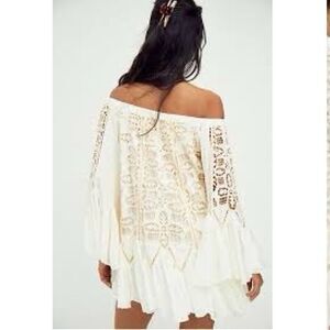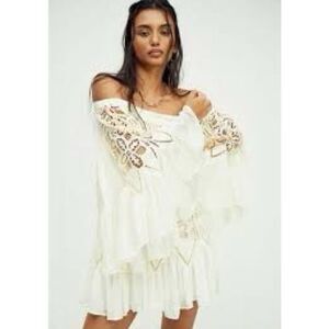 A stunning must-have, this mini dress features an off-shoulder design with statement embroidery throughout and exaggerated trumpet-style sleeves for a vintage-inspired gem.