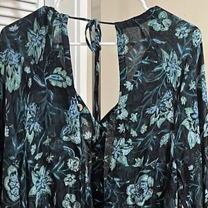 Features: Button-up neckline, defined cinched waistband, tiered shorts design, keyhole tie closures at back