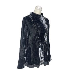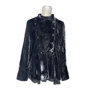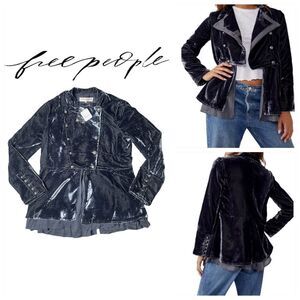 Free People Faye Jacket in Ebony. Add a luxe touch to any look with this vintage-inspired jacket featured in a gorgeous velvet fabrication with contrast trim and defined bottom hem for added dimension. Features a classic, relaxed fit. Defined collar, button-front closure, cropped top piecing, layered look at bottom hem. Vintage-inspired silhouette, this forever classic velvet jacket is the perfect piece to add to your coats collection. Color is like a dark charcoal or gun metal. 100% polyester exterior; 100% modal lining. Dry clean. Measurements in pictures.