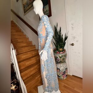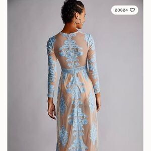Dramatic sheer net maxi with allover floral embroidered detailing in an elegant silhouette.