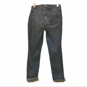 Distressed styling with a cropped frayed hem details 5 pocket skinny jeans.