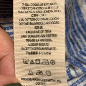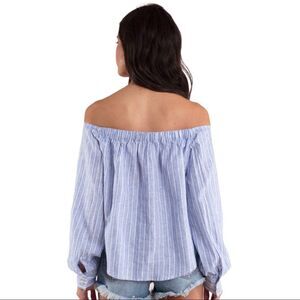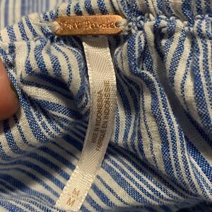 Free People striped button down off-the-shoulder top with front tie in style “Hello There Beautiful.” Armpit-to-armpit 23”, sleeve 23” and length 18”.