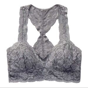 Stretchy floral lace racerback bralette with mesh lining and scalloped edges.