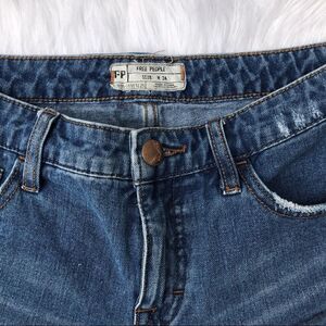 Free People Irreplaceable Denim cut off shorts size 24. Dark wash denim with raw hems. 5 pocket design and button with zipper closure. Distressed look and whiskering. Can be worn cuffed or straight. No stains or holes (other than distressed areas). So cute on!
