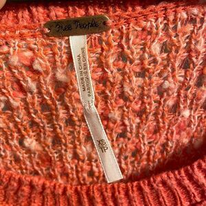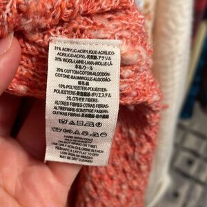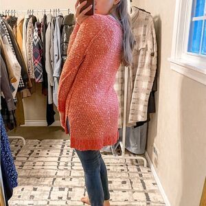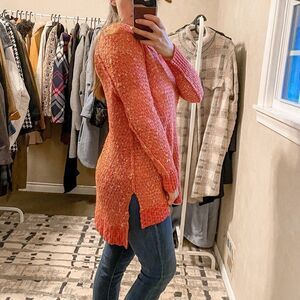 Features long sleeves, side slits, inside out seams, ribbed neck cuffs and hem, oversized fit, open knit, in color Nantucket red