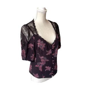 Gorgeous Free People top. Features fitted sweetheart bustling; balloon puff short sleeves, lace accents on back and shoulders (sheer) with full button front. Sweet top that’s absolutely gorgeous. Color is a deep brownish black with pink florals.