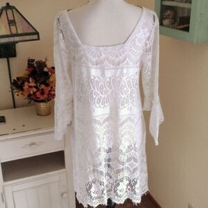 The dress I'm selling does not have a slip, or lining. This pretty lace dress could be worn as a cover-up or a dress (with pretty lingerie.) Square neckline. Juliette sleeves. Shift shape. Scalloped eyelash hem. Size M measures 38 at chest, 42 at waist, 50 at hips. 34 long from shoulder to hem. Wonderful however you choose to wear it.