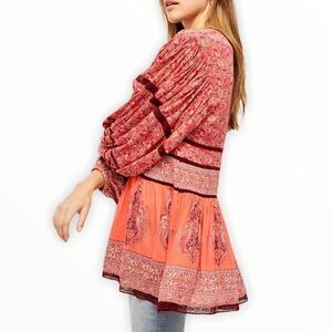 Free People “Luna Scarf Print Tunic” – gorgeous long top in ocean blue tones featuring boho inspired design, V-neck, long puff sleeves gathered at cuffs, flared cut, uneven hemline, micro pleats at waist. Beautiful style, indeed! Fits true to size.