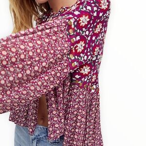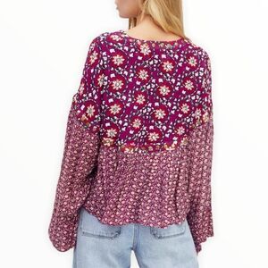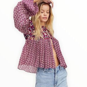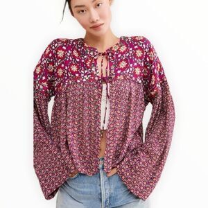 Matte gold-toned studs and subtle bits of sparkle add a bit of glamorous edge to this breezy tie-neck jacket from Free People, a bohemian printed piece styled with flowy sleeves.