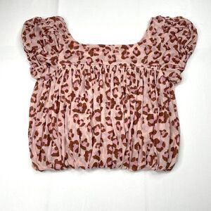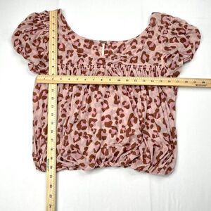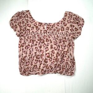 Free People Meg Blouse Highly sought after style! Gently preowned in overall good condition. No rips or holes. Made from lightweight, soft stretch mesh, decorated in flirty pink and brown leopard print, as it falls from square neckline into a relaxed bodice with short, elasticized bubble hem.