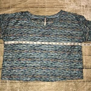 Good, preloved condition with flaw. Free People Multi-Color Boxy Fit Top. Shades of blue in a wavy pattern. There are two holes on the front, as shown.
