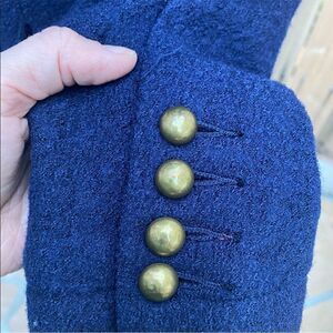 Thick wool navy coat, military style brass buttons. Size medium. Long flared pea coat