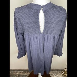 Smock at shoulders creates a gentle draped for free People wear anywhere, lightweight cotton design finished with tiny ruffles at the neckline and cuffs-3/4 length sleeves-solid color-crew neck-key hole and button closure-new with tags Hanging