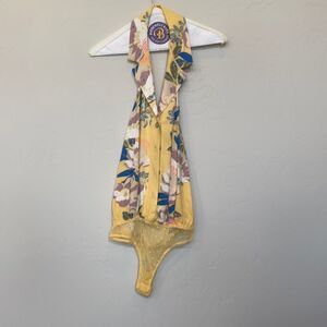 Free people bodysuit with collar and tan buttons. Mesh at the bottom for snaps.