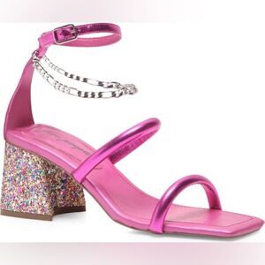 Gleaming chain hardware lends an edgier design to a strappy sandal crafted from smooth leather complete with a block heel and squared toe.