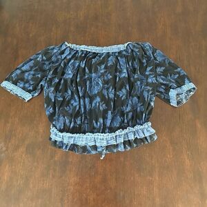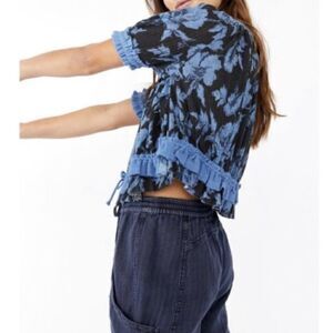 Cute Free People blousy crop top in black with blue floral print. Button down, rounded collar plus ruffle & tie detail. 3/4” sleeves. Polyester and viscose blend. Length 17 1/2” x Width 20” pit to pit.