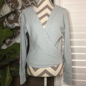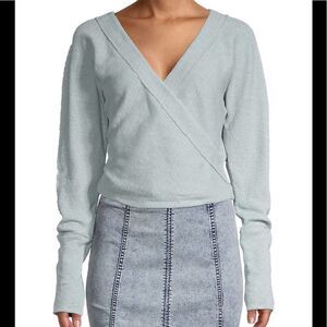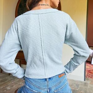 We the free by free people lupine tee in polar fog size XS. Baby blue color. Forever essential, this timeless tee from our We The Free collection is featured in the perfect waffle knit fabrication and wrap-front style for an always classic look. Waffle knit design. Stretchy. V-neckline. Wrap style front. Long sleeves. Exposed seam detailing. Cropped length. 96% Cotton/ 4% Elastane. Brand new with sample tag attached, no flaws.