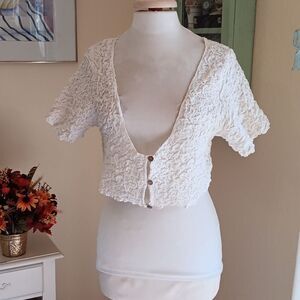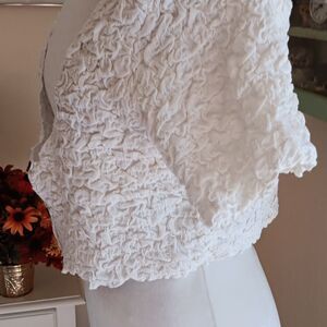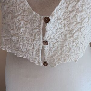 The fabric is cotton. It is smocked and shirred to create a sweet puckery look that stretches over you beautifully. Short sleeves. Three button. Cropped length. Size L measures 36 at chest. 34 at bottom hem. ( all stretch) 16 long from shoulder to hem. Wonderful on a warm day.