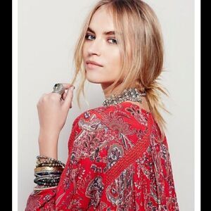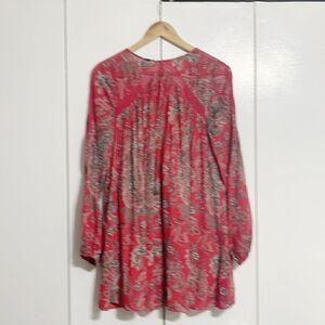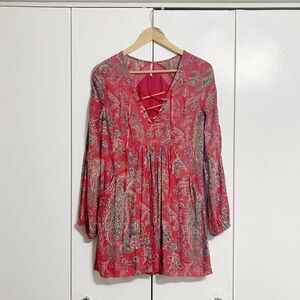 a shapeless, swingy silhouette,, this effortless printed mini dress is perfect for anything! Lace-up detailing on the neckline, crochet trim, and elastic band on the cuffs. Front pockets. Lined.