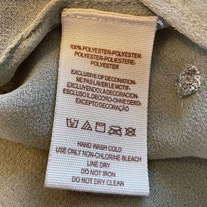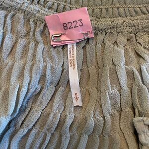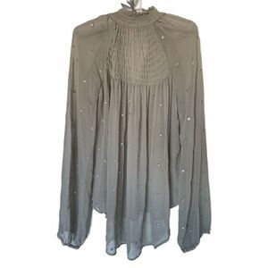 Greenish-Gray embellished with silver polka dots. Semi-sheer long sleeve with smocked chest and collar. Loop-it button front closure.