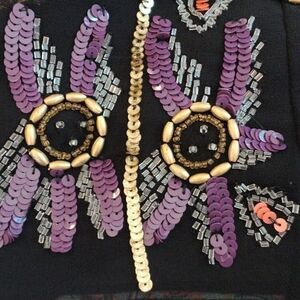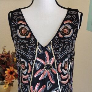 Very retro with a speakeasy inspiration . Embroidered and embellished ( sequins, beads, threads) front and back on sheer fabric. Fully lined. Designed to fit loose and straight. Deep V in back. Size XS measures 38 at chest, 36 at waist, 38 at bottom hem. 31 long from shoulder to hem. Make a statement, wear as a dress or with leather pants, something satiny. You'll feel beautiful.