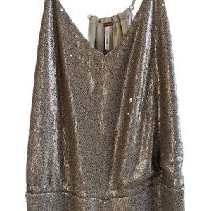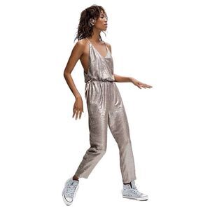 Shiny sequin jumpsuit featured in a slouchy silhouette with straight legs. Dramatic dropped an armholes with side ties. Adjustable straps. Lined.