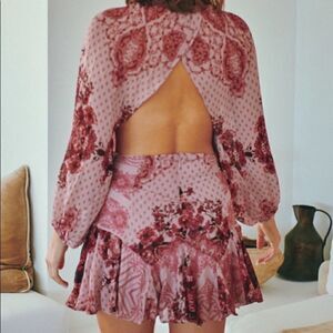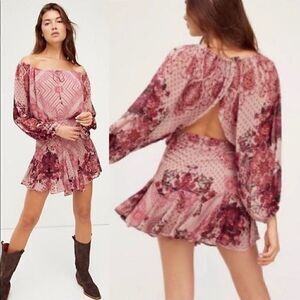 So pretty and printed, this puff-sleeve mini dress features a billowy top and fit-and-flare skirt with exaggerated open back for added shape.