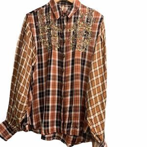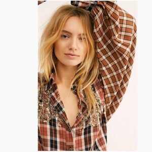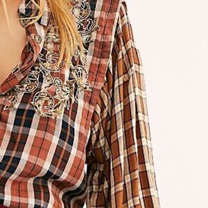 Free People Snow Top Mountains Plaid Shirt Lightweight plaid buttondown top featuring beautiful embroidery and sequin detailing along the neckline.