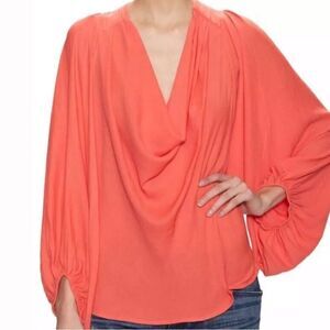 Free People Semi sheer cowl neck blouse featuring wide sleeves with elastic cuffs.