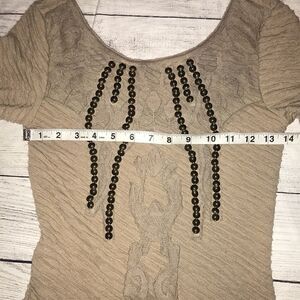 Good, preloved condition. Free People Studded Textured Bodycon Dress. Tan shade. 3/4 length sleeves. Fitted. Lined. Some typical signs of wear including small pulls or slight wash wear.