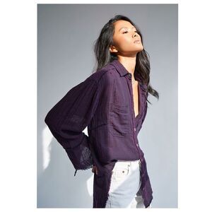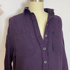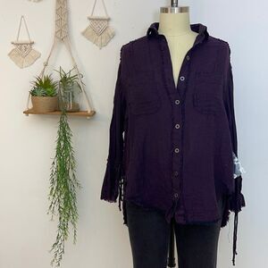 Features: beautifully detailed button down, raw edges, flared sleeves with and opening and string ties, high-low hem, includes purple and black weaves, beautiful color