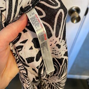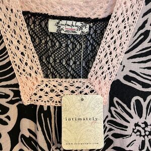 Features: sleeveless silhouette, pull on styling, unlined, open knit crochet along neckline and back panel, flowy lightweight fabric, black and pink daisy print