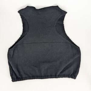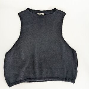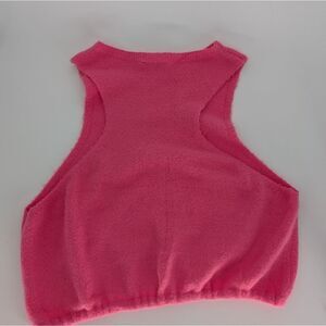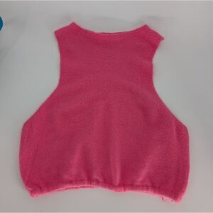 The "Free People Warm Fluff Crop Top" is a fuzzy knit, sleeveless crop top with a high crew neckline, ribbed trim, cinched hemline, and racerback. It is made of 99% Polyamide and 1% Elastane. The top is designed for a relaxed, cropped fit and is described as an elevated top for in-between-season styling.