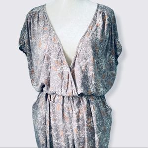A flouncy tie snugs the waistline of a vintage-inspired short-sleeve jumpsuit featuring a plunging surplice front, V-back and straight-leg pants.