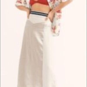 A-line maxi skirt pieced with panels of smooth silky fabric and shiny metallic. Striped elastic waistband
