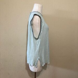 A lightweight muscle tank is a chic new piece that is perfect for summertime wear. There is a snag on the bottom front that blends into the distressed look.