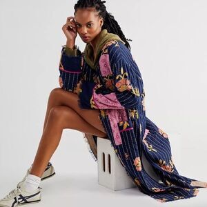 Casually cool and one-of-a-kind, this so cozy duster is featured in a shapeless silhouette and perfectly patchworked fabrication with side slit detailing and raw edges for a lived-in look.